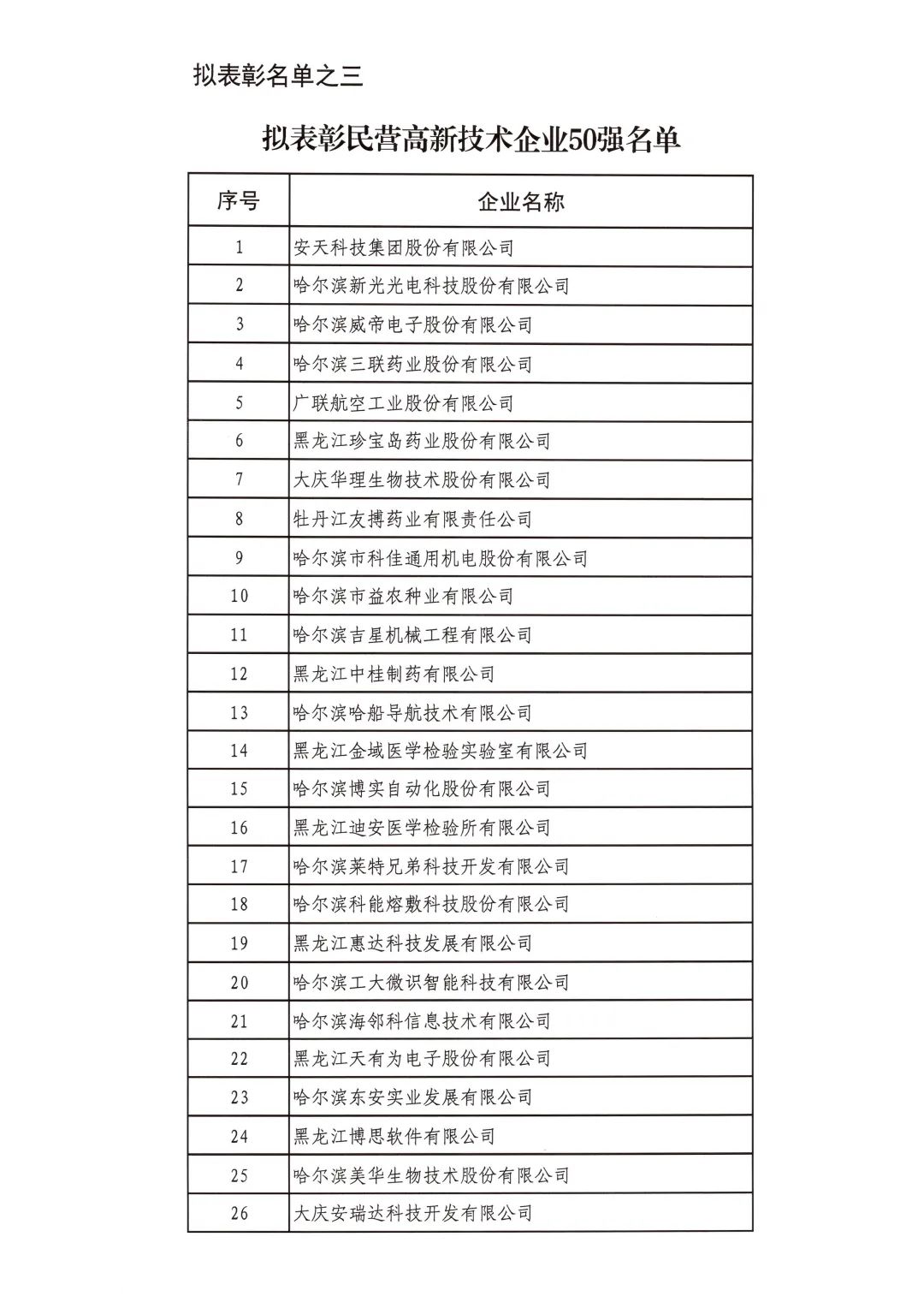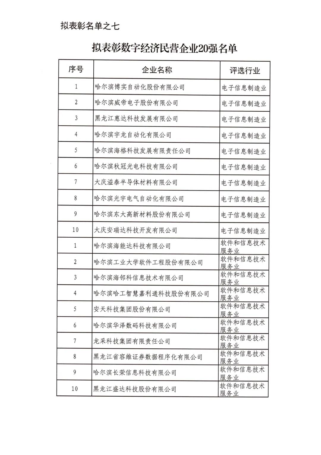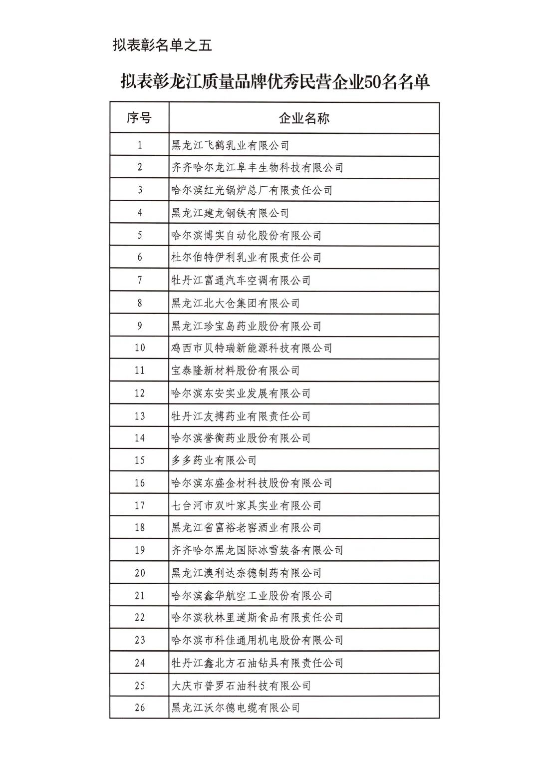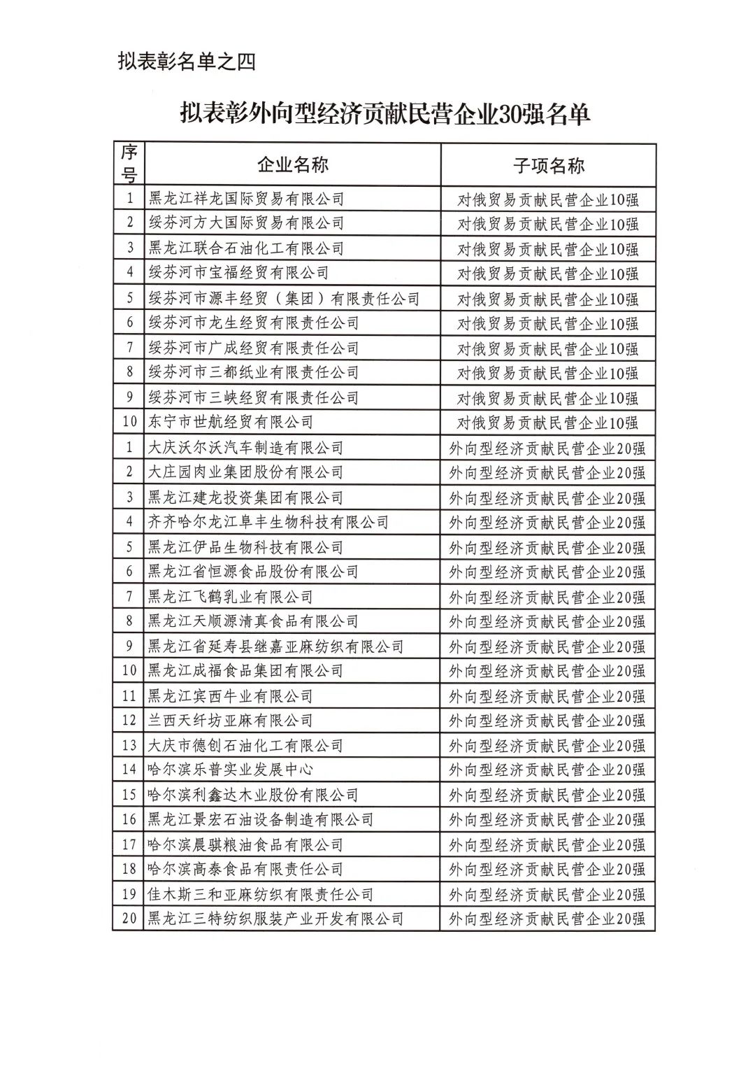 按照省委省政府關(guān)于召開全省民營經(jīng)濟(jì)大會(huì)的決策部署要求,擬對(duì)全省優(yōu)秀民營企業(yè)進(jìn)行表彰。經(jīng)企業(yè)自愿申報(bào)、市(地)把關(guān)推薦,評(píng)審小組排名,征求相關(guān)部門意見等程序,擬表彰全省累計(jì)納稅民營企業(yè)50戶、就業(yè)突出貢獻(xiàn)民營企業(yè)20戶、民營高新技術(shù)企業(yè)50戶、外向型經(jīng)濟(jì)貢獻(xiàn)民營企業(yè)30戶、龍江質(zhì)量品牌優(yōu)秀民營企業(yè)50戶、生物經(jīng)濟(jì)民營企業(yè)20戶和數(shù)字經(jīng)濟(jì)民營企業(yè)20戶。現(xiàn)將擬表彰名單予以公示。